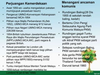 Menamatkan ancaman komunis di Tanah Melayu iaitu pada 8 Disember 1941. Bincangkan 4 sumbangan Tunku Abdul Rahman Putra Al-Haj sebagai Perdana Menteri Pertama Malaysia. Sumbangan pertama beliau ialah untuk memupuk kerjasama di antara kaum dan dalam masa yang sama menjaga keutuhan bangsa Melayu seperti hak-hak istimewa bagi orang-orang Melayu penerimaan Bahasa Melayu sebagai Bahasa Kebangsaan dan asas dasar pelajaran.